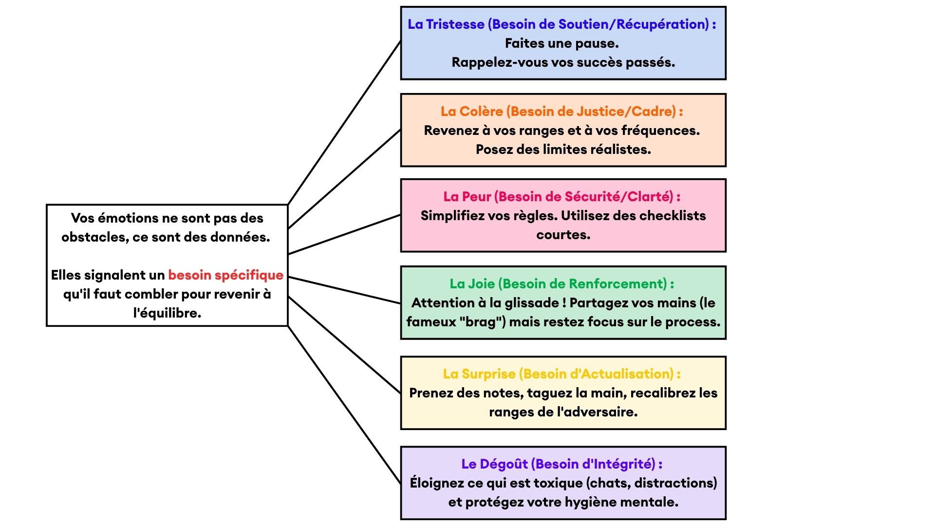 La Tristesse (Besoin de Soutien/Récupération) : Faites une pause. Rappelez-vous vos succès passés.