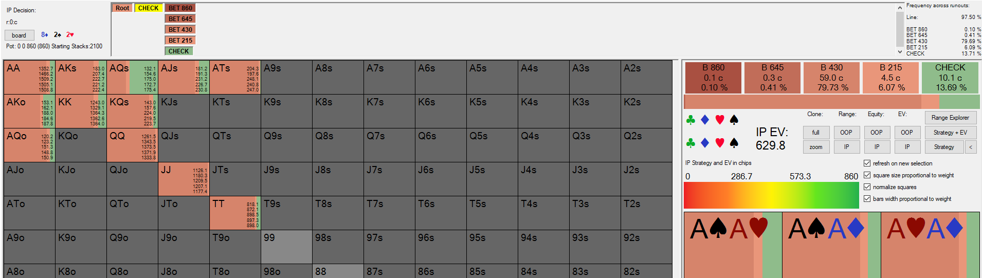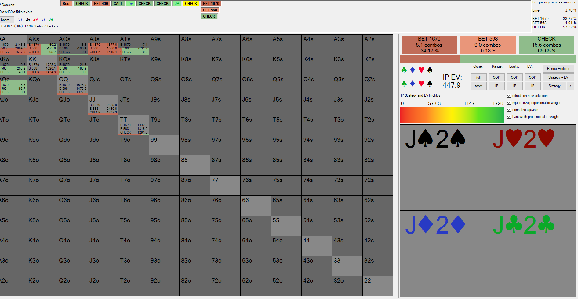 Je n’ai jamais ouvert de solver mais j’imagine qu’ici on doit pouvoir 3barrel bluff très facilement si le board reste Middle/Low étant donné qu’on a un gros avantage de nuts.