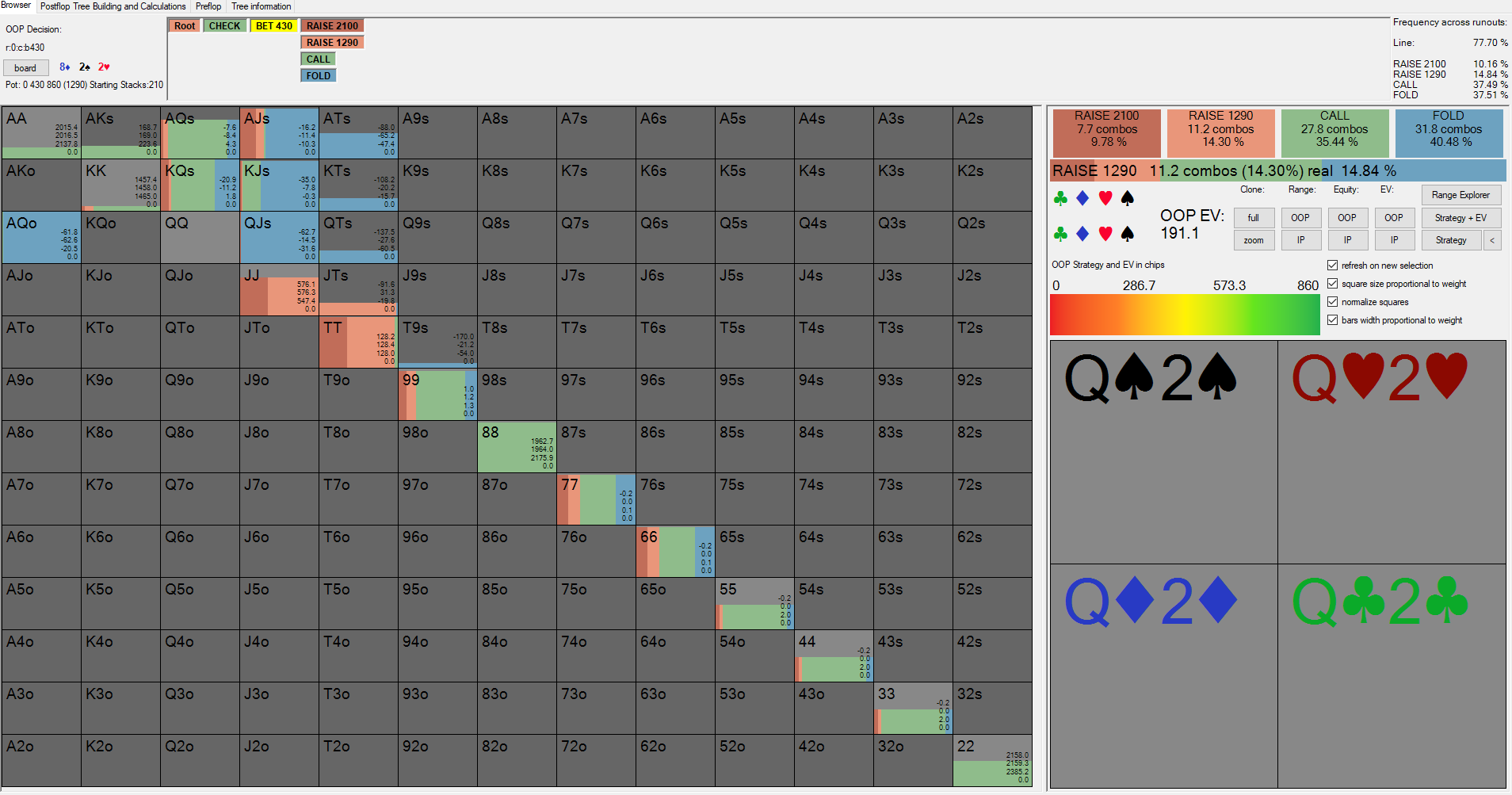 Si notre plan est de bet flop et turn, il faut un peu mieux descendre son size flop, pour maximiser lev sur les xc xf, sans pour autant que vilain s’en rendre compte.