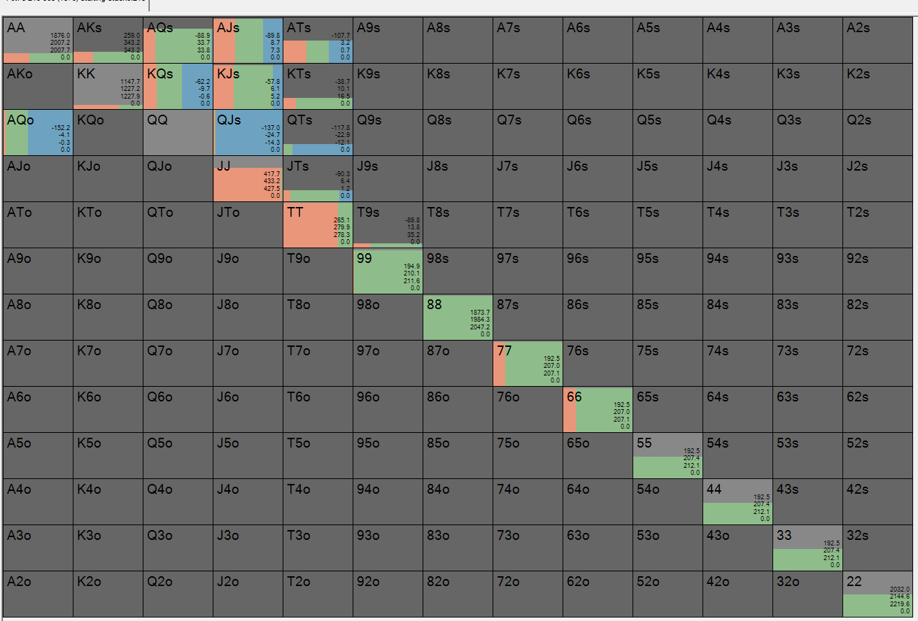 Alors oui et non, avec ma range en 100 je vais pas le faire car j’estime que j’ai d’autre mains qui on moin de SDV, mais ici je suis pas sur qu’on gagne souvent, donc j’pense que j’aurais XB AK AQ et shove ATs KQs