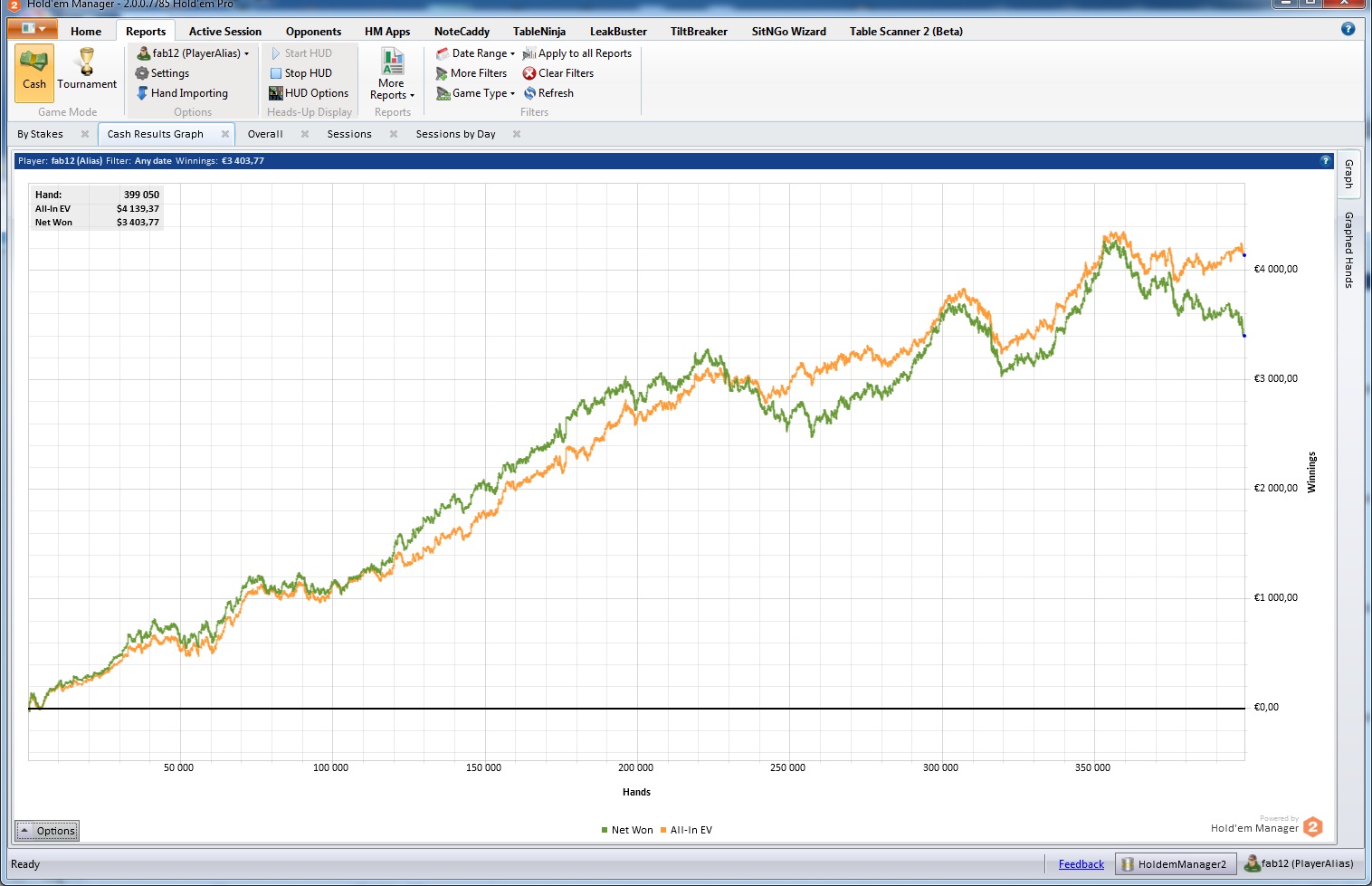 Voila mon graph après 400k mains. On voit bien la tendance haussière et je ne pense pas avoir changer grand chose à mon jeu.