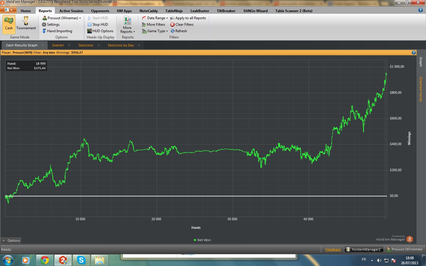 Donc pour l’amateur du poker que je suis, je peux envoyer du volume, c’est ce que j’ai fait j’ai joué 50 000 mains en 15 jours bien motivés, bon j’avoue qu’il y a 10 K hands de NL 2, 20K h en NL 10 et le reste en NL 20/30