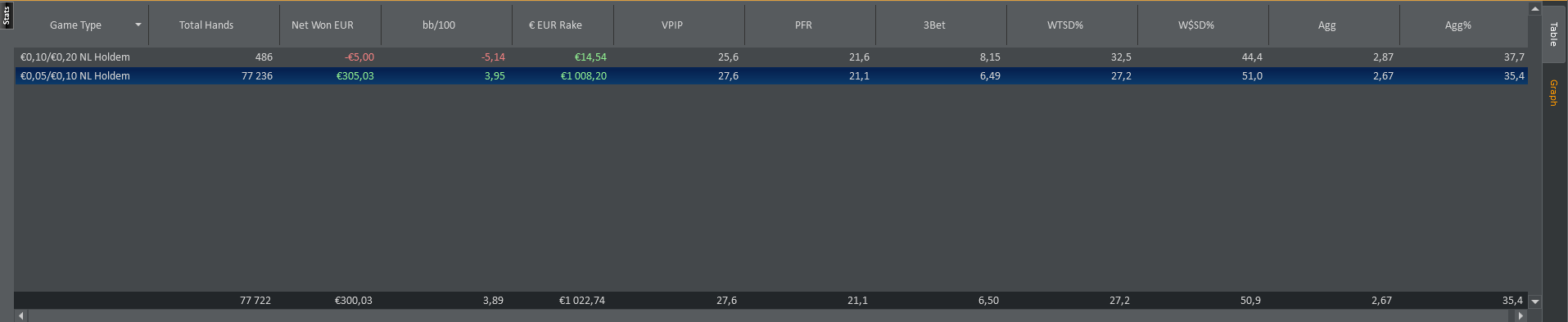 Le gros problème je pense que c’est le volume. 77 000 mains ! C’est énorme ! Et surtout, à quoi ça sert de jouer autant pour progresser ? Dans la phase où tu es, tu ne devrais pas excéder 30 000 mains et surtout te focaliser à review tes mains et analyser tes erreurs. Vu de loin, je pense que tu te laisses encore trop emporter par le jeu, je doute que toutes ces sessions aient été jouées dans des conditions optimales et quand bien même elles l’auraient été, poses-toi cette question simple : est-ce qu’il ne vaut mieux pas transformer le temps passé à jouer 20 000 ou 30 000 de ces mains à l’étude du jeu ? Penses-tu que ces 20 000 mains t’ont apporté autant que leur équivalent en analyse Flopzilla, en postage sur le forum, en relecture de note sur des vidéos ? Perso je suis arrivé jusqu’en NL 50 en jouant exclusivement 4 tables et c’était pas sur le logiciel Winamax. Et justement, c’est le fait d’avoir jouer aussi longtemps sur 4 tables qui me permet aujourd’hui d’en jouer 12 avec de bons winrates jusqu’en NL 20/30.