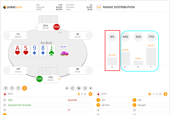 tu vois que la distribution de ton propre range (j’ai viré 67 de ce que tu peux avoir dans la mesure où sur un board comme celui là, il semble assez incohérent de ne pas bet cette turn!)