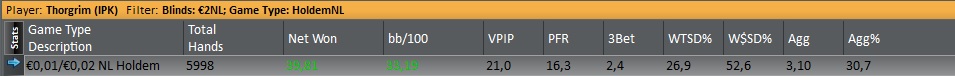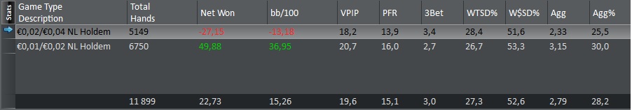 J’ai joué 4 heures l’après-midi et 1 heures le soir pour un total d’environ 1200 mains. La session s’est très bien passé mais je me suis rendu compte que j’ouvrais un peu trop demain et que je cbetais beaucoup trop flop donc stats à revoir à la baisse pour la prochaine session.