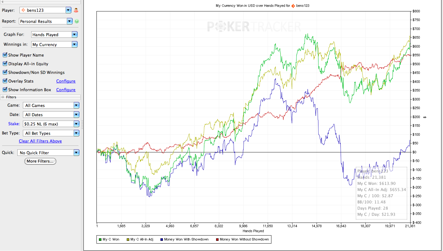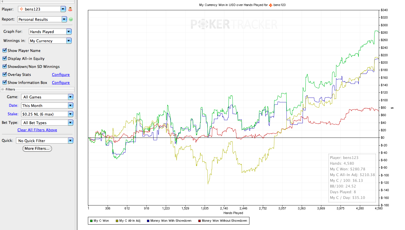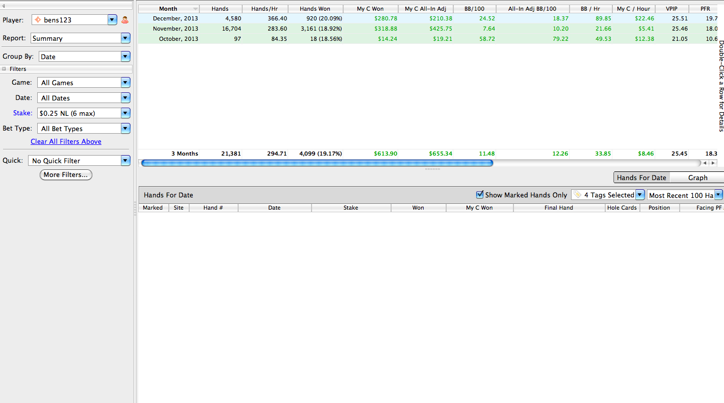 J’ai donc eu 1 semaine de pause, ou j’étais vraiment dégouté du poker online. Depuis j’ai repris en décembre le grind, je joue lorsque j’en ai envie, et non plus par contrainte de volume. Le point positif dans tout cela? Et bien c’est que je n’ai pas tilté en 6-max, donc il y a un petit espoir d’arriver à mon objectif ( NL50 )… Pour cela il faut arrêter de jouer en HU