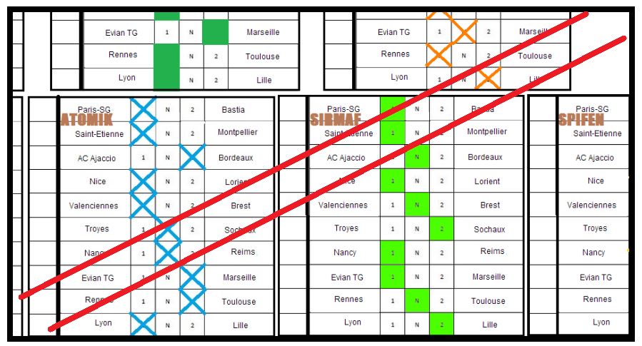 bref, ça a de la gueule le truc ou pas? comme vous l’avez compris, en rouge c’est les matchs corrects, j’ai mis tout les pronos de la même couleur, c’est plus lisible (pas de risque de m’être trompé là dessus étant donné que je prends vos grilles et que je repasse en bleu sur vos croix, étoiles ou autres, donc normalement c’est oki)