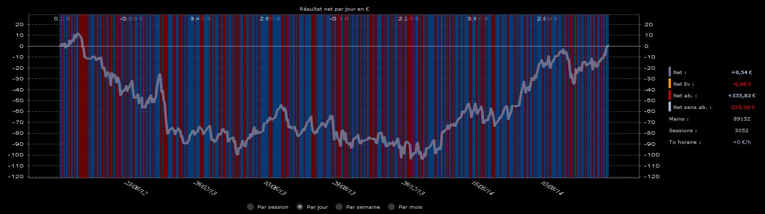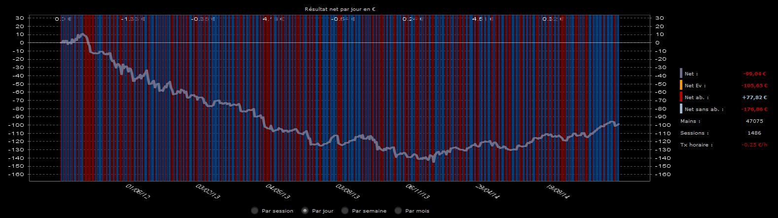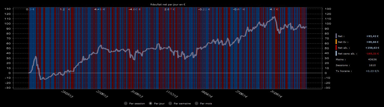 Bon pour dire que les résultats de poker s’apprécient sur le long terme , dans mon cas c’est vrai (bon je joue a peine 1H /jour 100 a 150 mains , moins quand j’arrive a faire rapidement 1 a 2 E de benef )