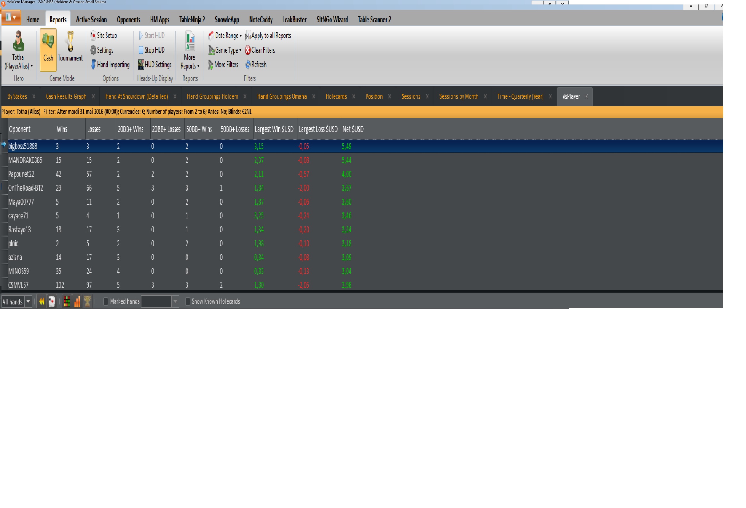 Rémi le filtre qu’il te faut c’est “Vs player” dans “More Reports”: tu as tout le détail des gains/pertes,très utiles pour savoir qui est ta bête noire. B)