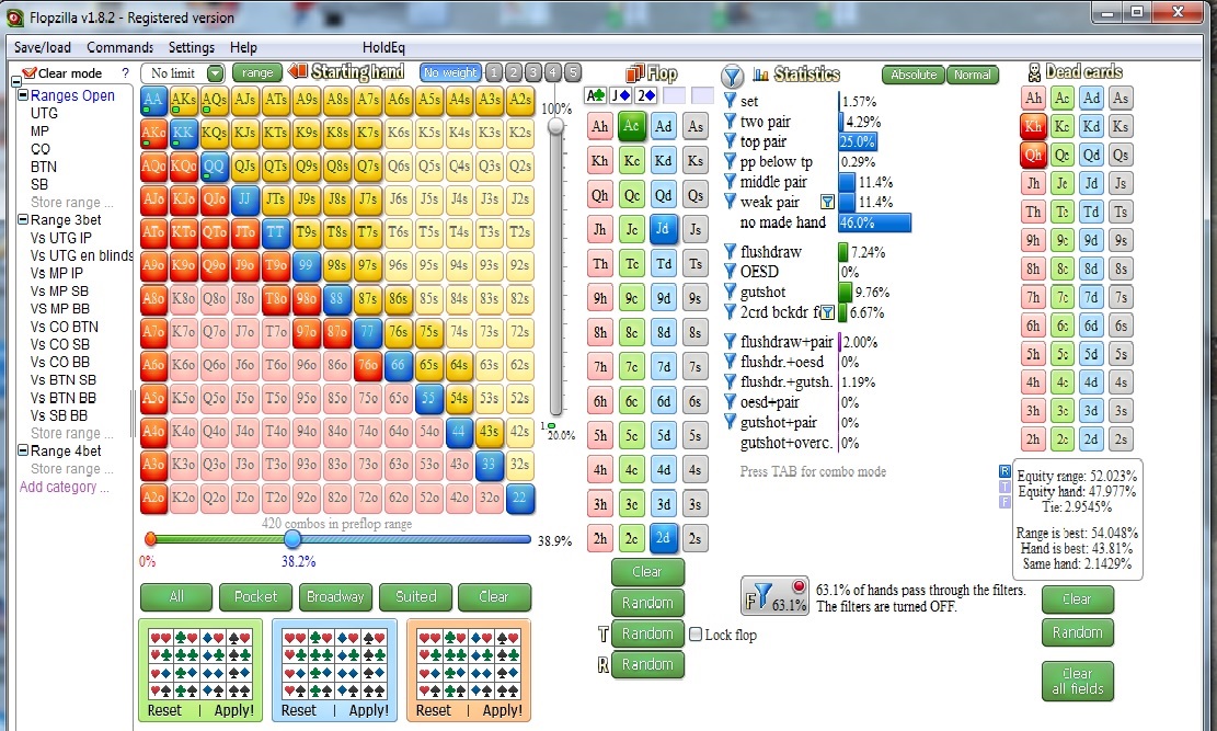 En partant de ton énoncé, Je lui ai mis une range très très loose de call 3bet (39%sur ses 48% d’open)ce qui est optimiste pour notre main