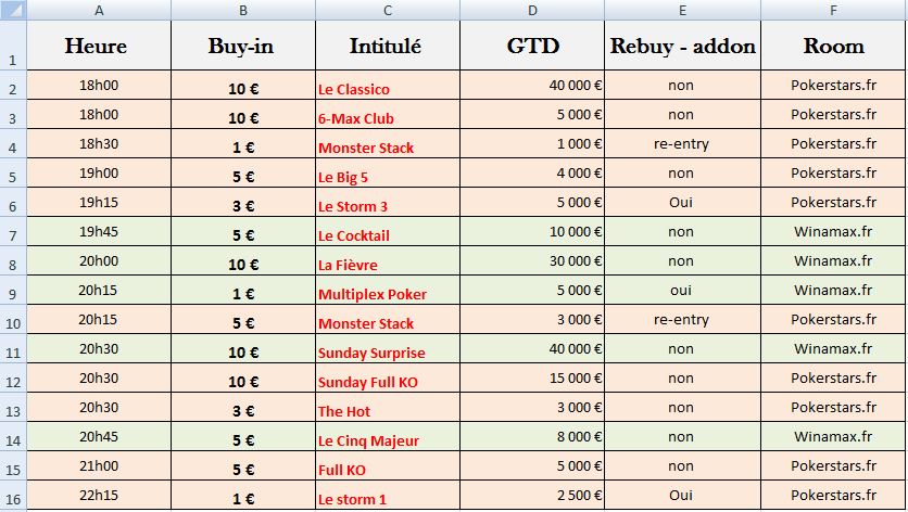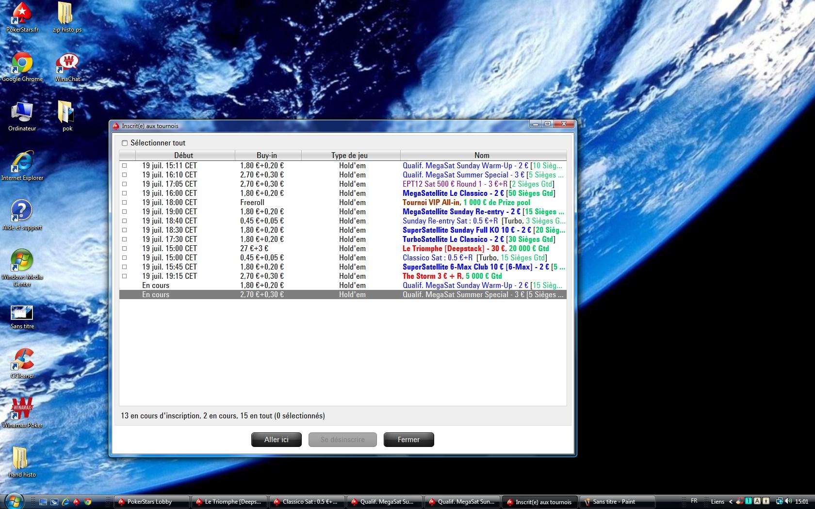 Petite session de MTT du dimanche pour moi aussi, ça faisait longtemps. Perso je me fais jamais de programme, je pioche dans les tournois qui m’intéressent pour avoir en permanence 6 tables d’ouvertes à la fois. Il me restait 30 euros de tickets de tournoi sur PMU, donc j’ai lancé un 20e et un 10e, et pour le reste je rajoute des MTT à 2-3e de Wina voire plus si affinité (enfin si sat gagné quoi :p).