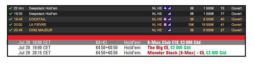 Aujourd’hui, je vais privilégier la qualité à la quantité… J’ai essayé de faire de m’inscrire de façon à ne pas m’ennuyer de trop sans être surchargé de tournoi full ring où tu attends les aces pour bust d’ailleurs, si ça continue, je vais arrêter les tournois full ring, c’est juste nul au possible (enfin, “je n’aime pas”)