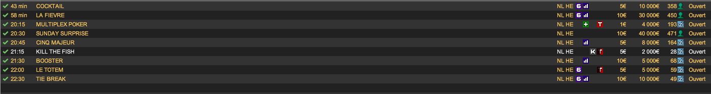 La session avait très bien démarré mais les bad ont eu raison de moi. Bust du cocktail AK < A8 PF. Perdu un pot à 80BB sur le 5 majeur AA < QT PF … Mais bon il reste des tournois donc il reste de l’espoir ! Courage les gens