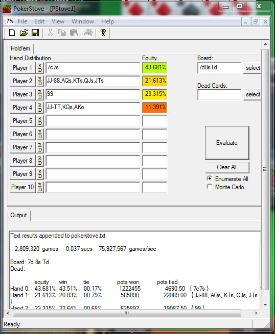 En attendant on peut dans un premier temps voir ton équité au flop vs leurs ranges de call pre en excluant toutes les mains qu’ils raisent pre plus de 50%.