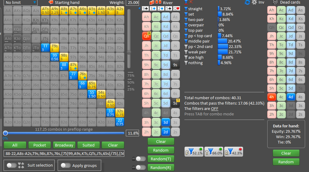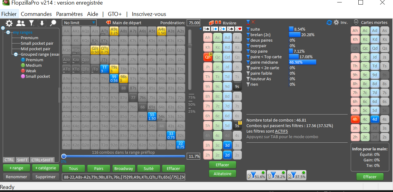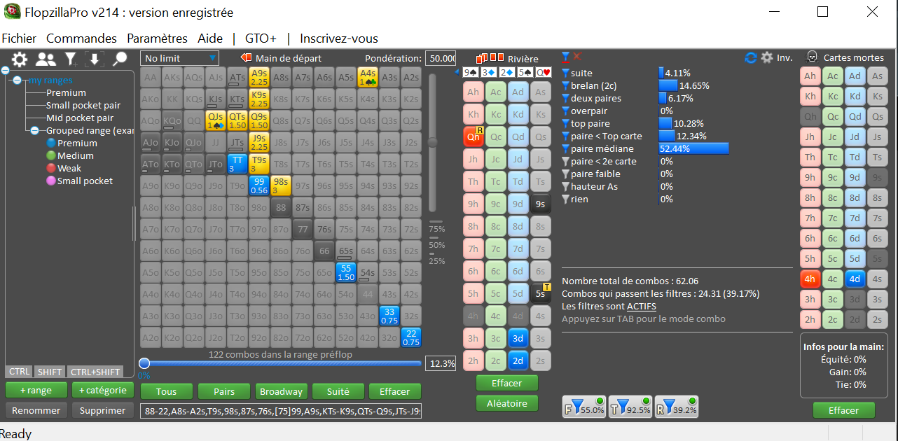 Or dans ma sim, j arrive à ce repère, si je fais fold 66-88. N est pas un peu trop ambitieux, face à un regfish ? De plus, ne suis pas je trop haut pour bluffer ? En effet, je suis devant ses draws et une partie de ses paires plus draws ?