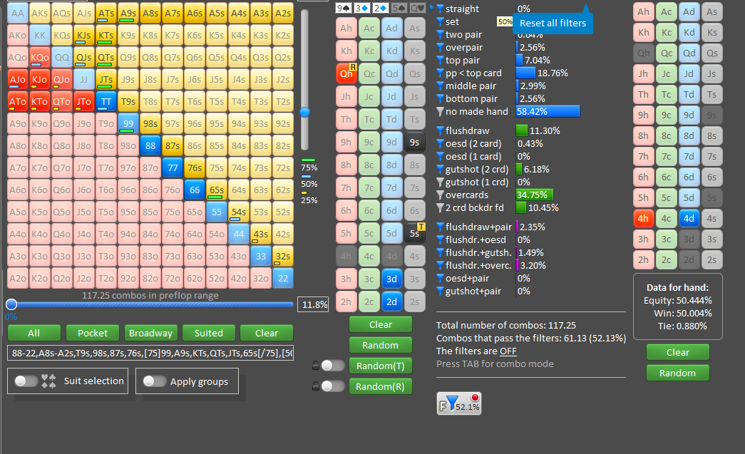 Vilain a call ses sets, ses DoP, ses OVP ses TP, les médium paires quI seraient encore présente R (66-88) que tous les flusdraws plus paire (A2, A3, A5, 45, 56) plus ses flusdraws avec gutshtot (Ax de carreau)