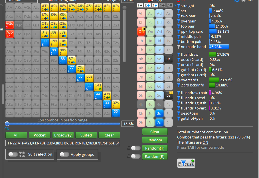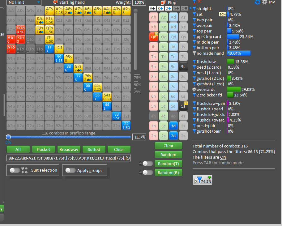 NB : Cette range me paraît discutable. J ai choisi donc, de pondérer au max les brodways off suit, ainsi que les lows SC.