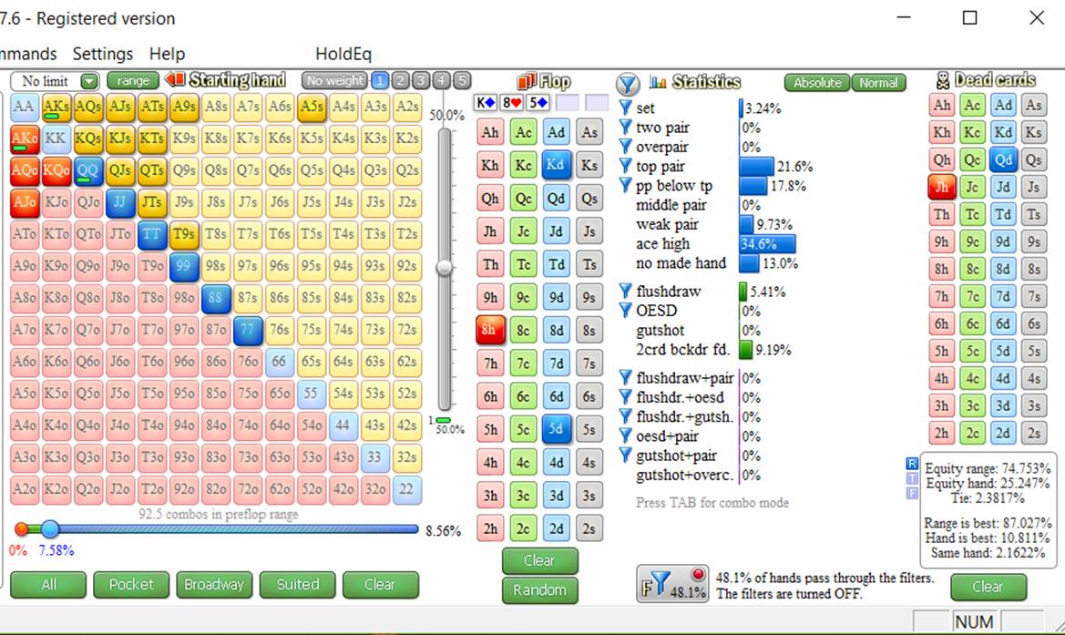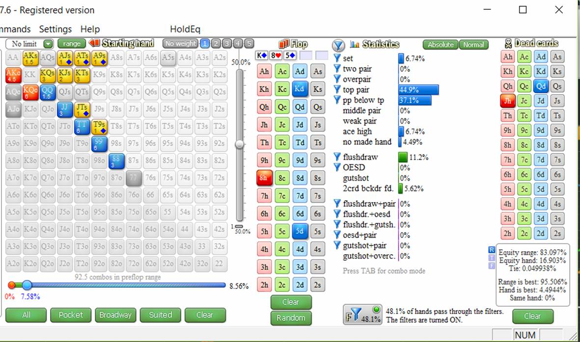 Bon alors je viens de regarder avec plus d’attention de flopzilla de Duxili. Globalement je suis d’accord si ce n’est que je vais chipoter sur la proportion de QQ et AK, je vais plus mettre 20 % car beaucoup de regs 3bet ça en auto selon moi.