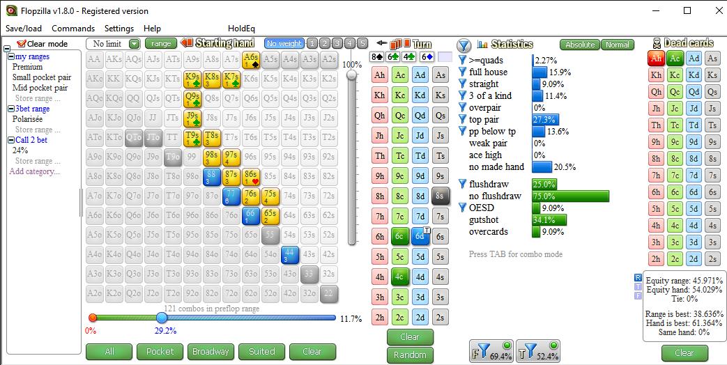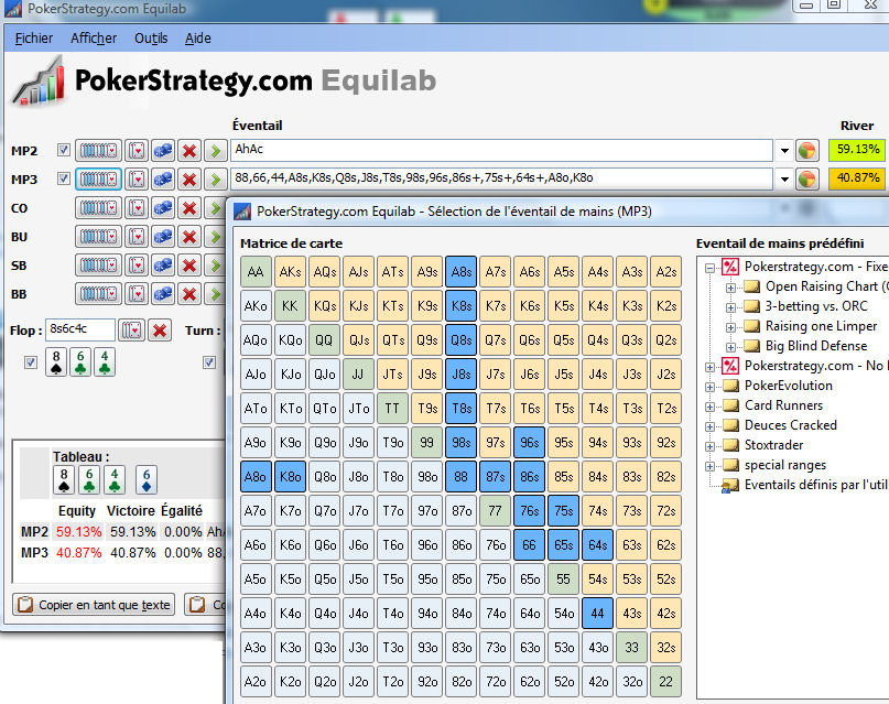 Okay avec cette range mais j’ai enlevé les A8o et s qu’il va iso raise pré-flop au BTN je pense quand même. Et j’ai ajouté A6s. Du coup, contre cette range on a 55% d’équité. 59 si on ajoute les A8. Maintenant, c’est son sizing quoi… :sick: