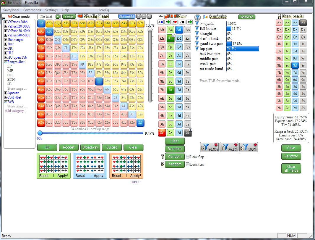 Si je me trompe pas vilain a : A7s ( 2 combos) / 77 ( 3 combos) A2s ( 2 combos) sachant qu’on a un as dans notre main.
