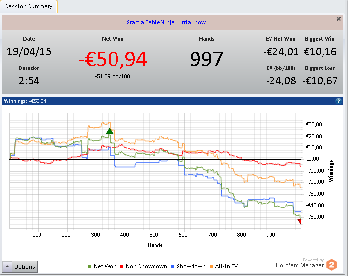 Je perd 30 balles en 3 jours. River incroyable tout le temps, les mecs nutsé sans arrêt! Ces connards chattent les all in alors qu’ils partent à tapis avec des merdes incroyables! Et de mon côté rien ne rentre, pas un flop correct, que dalle! J’en ai vraiment marre là!
