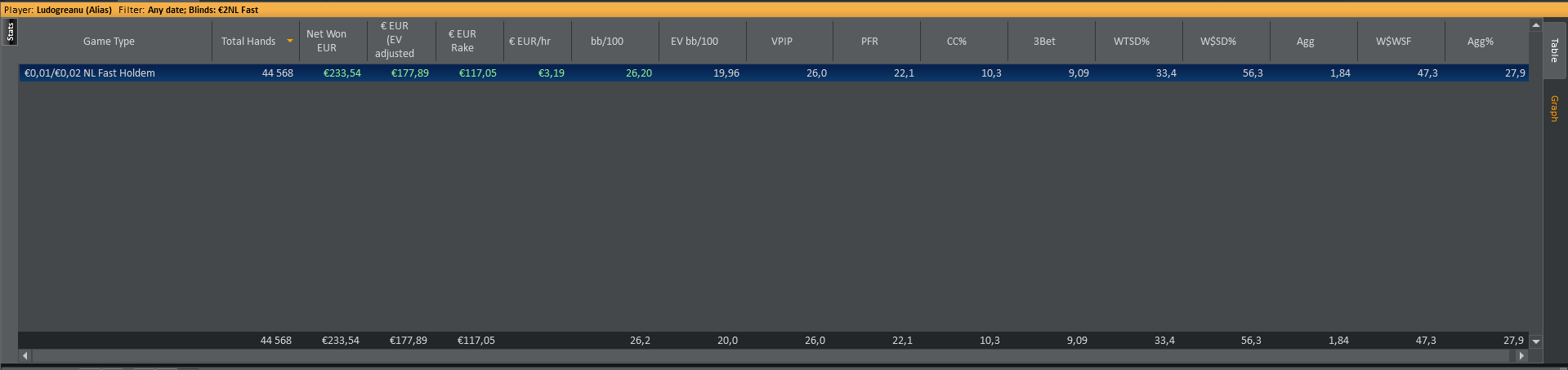 Ceci dit j’ai fait presque 45k hands sur ce format sur Poker Stars en NL2 Zoom, bon l’avantage c’est que j’avais les stats, sur PS c’est possible. Jamais testé ce format sur Party, j’ai essayé un peu sur Wina le Go Fast, mais là c’est impossible d’avoir les stats et dans HM 2 y’a pas de distinction Go fast et table normale du coup j’ai vite laché l’affaire. Mais sur PS, c’est intéressant, on peut vite se rendre compte des déglingos qui sont prêt à lâcher leur cave :cheer: