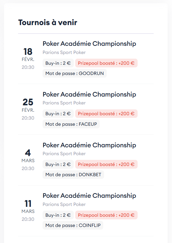En cas de doute, n’hésite pas à visiter notre page d’actualités où tous les prochains tournois sont listés, avec leurs MDP :
