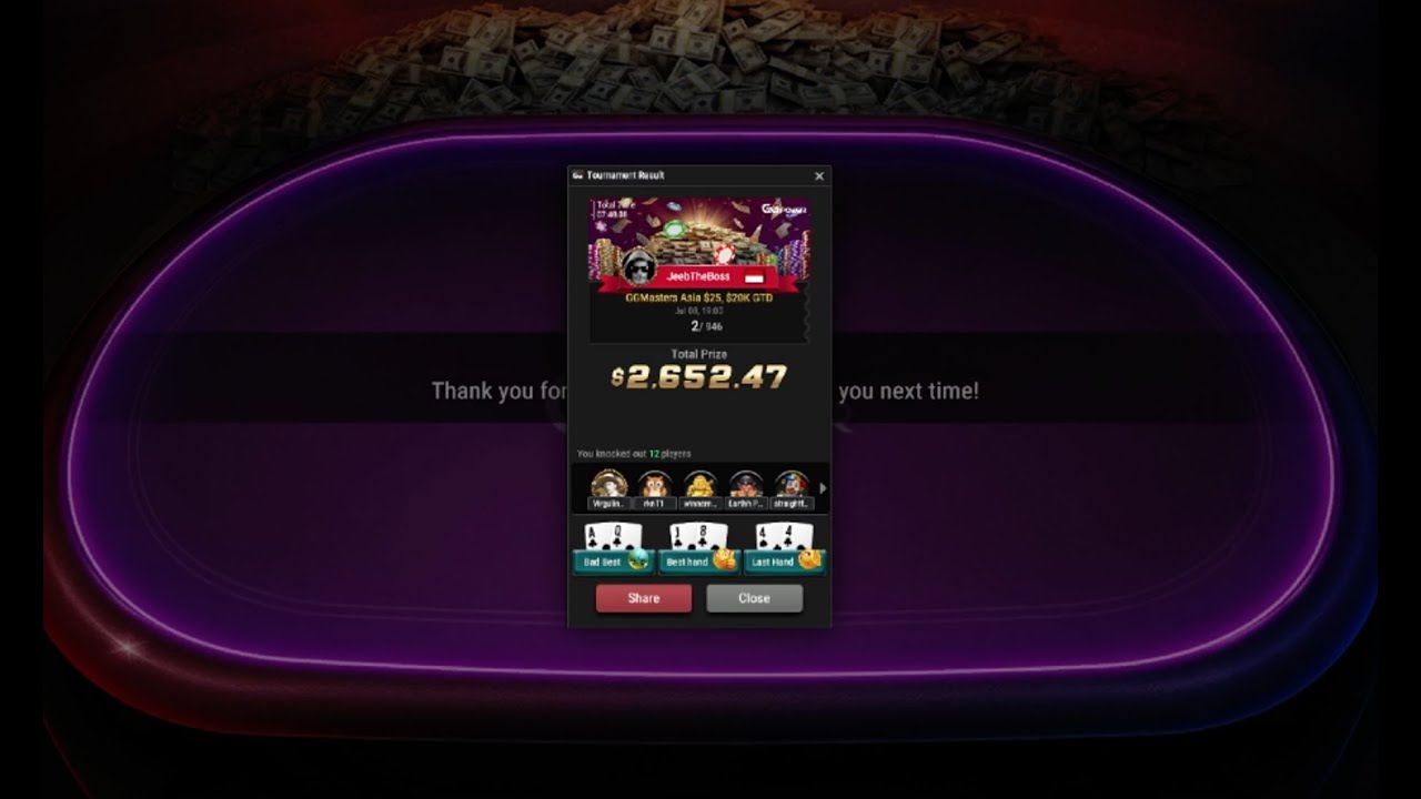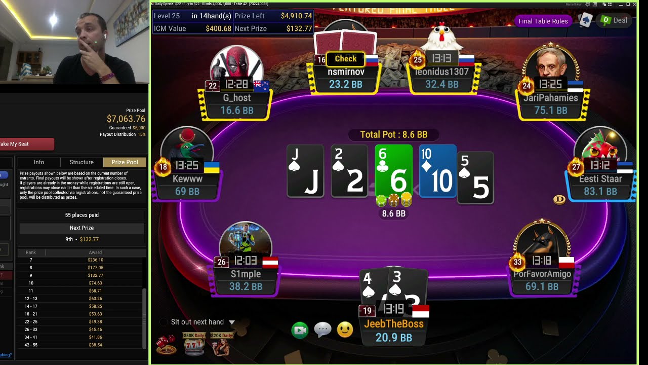Ici la vidéo du tournoi que je viens de finir il y a 2h, tournoi avec un buy-in de 22$ pour 7.000$ Gtd, sur GGPoker. N’hésitez pas si il y a des spots dont vous voulez discuter, ou commenter. Je n’ai pas la prétention de dire que toutes mes décisions sont bonnes, bien au contraire. Donc c’est ouvert à la discussion