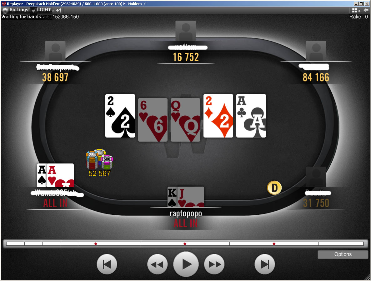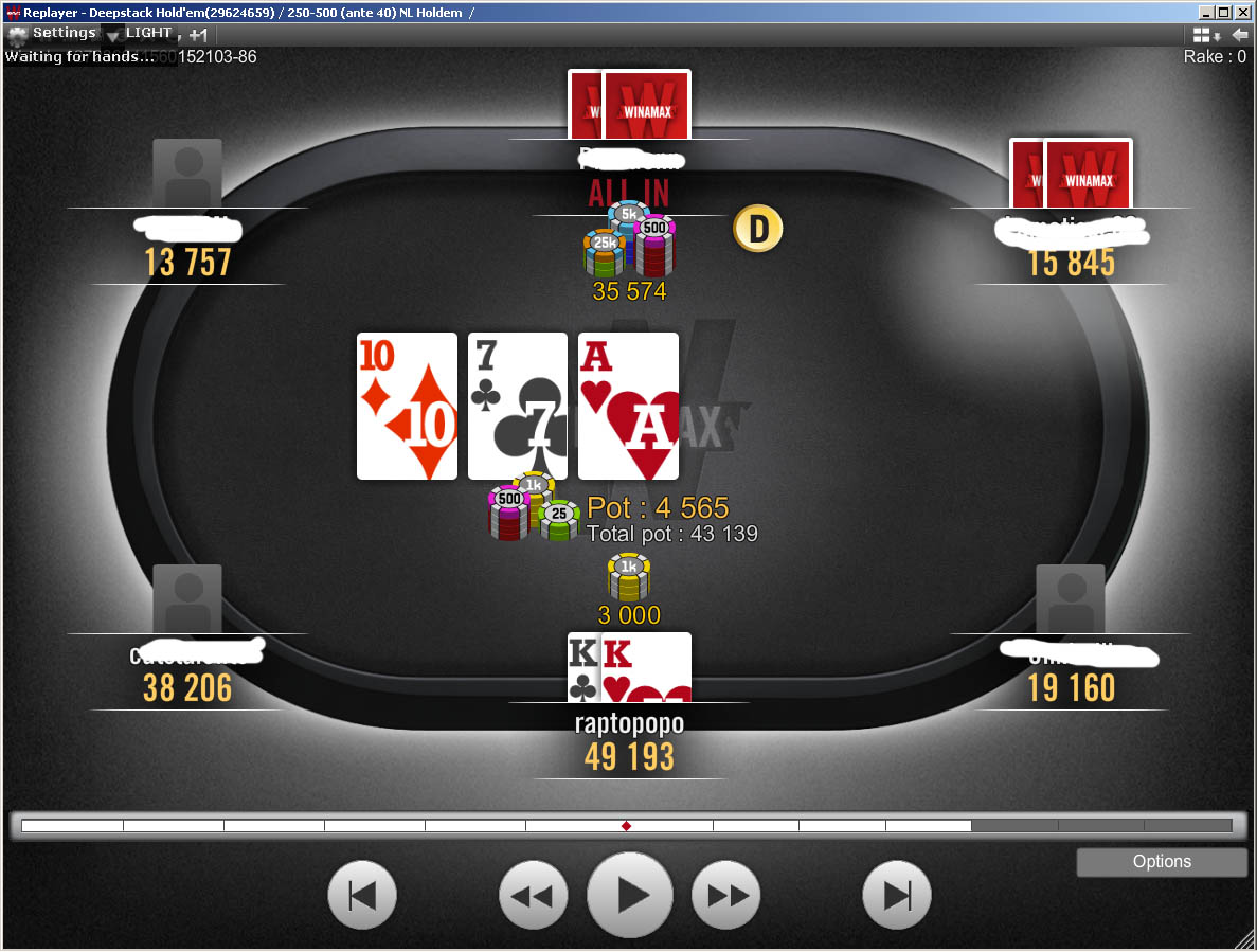 J’ai cherché à bosser les fins de tournois, le jeu en TF, mais rien n’y fait pour l’instant. Sur certains tournois (pas tous malheureusement…), la review ne me montre pas d’erreur manifeste, mais les hasards du jeu font que les shorts triplent, que je stagne et, les blinds aidant, le stack diminue. Chaque prise de risque rencontre les AA et au revoir… :laugh:
