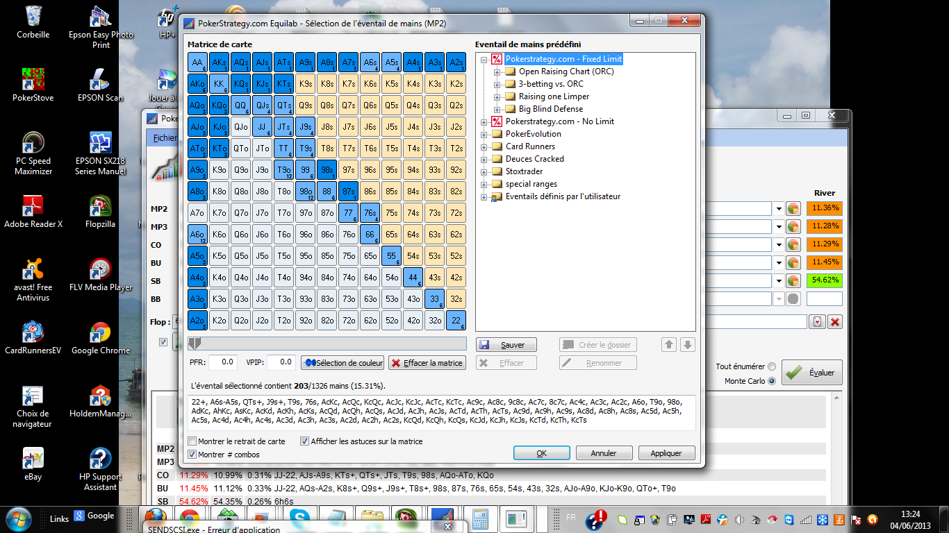 LE truc c’est que j’ose éspérer qu’il a conscience que sur 652ccc, vs un cbet et un call in 4way je fold just any 6x et 99-, donc ici ma range de c/c c’est quinte floppée, flush floppée, Ac naked et set et a la limite TTcx, je squeeze obv JJ+, et maybe paire plus gutshot avec un trefle… mais je compléte que très rarement des garbage en sb.