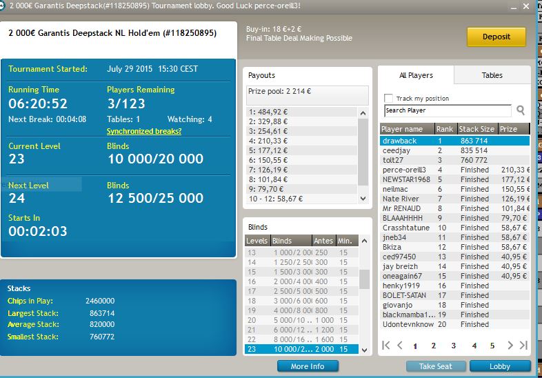 c pas un gros gain mais vu les roi et LES bkrll de la TF, je suis content.Je me suis fais encerclé par plusieurs pokerstrateges lol.IL m ont mis un genou un terre mais je suis battu jusqua la fin.MDR :wink: