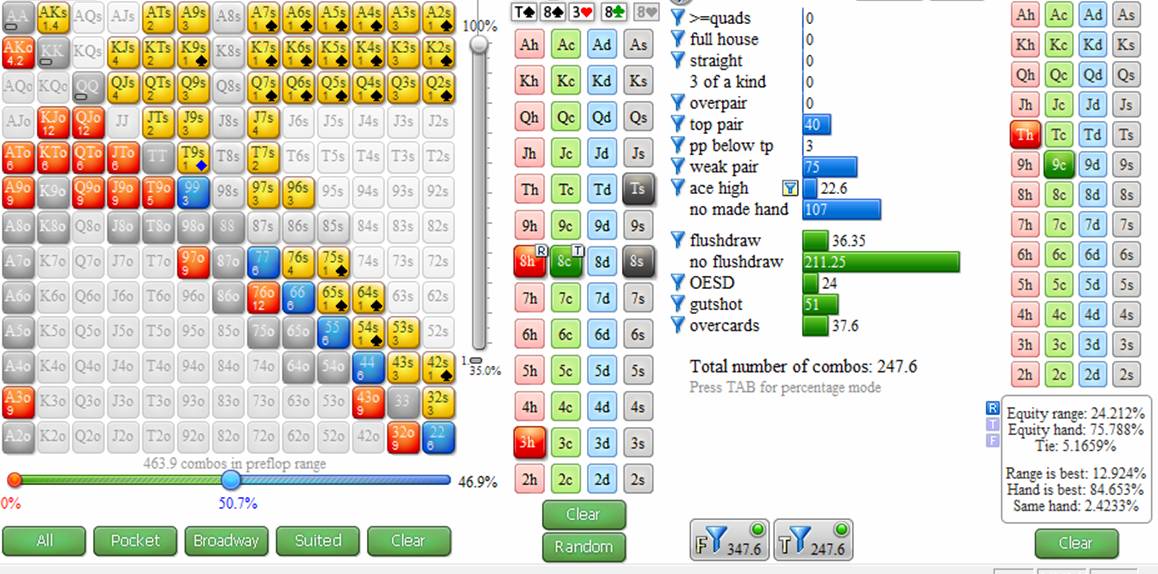 Voilà, c’est ce type de travail qui va vous aider à visualiser les ranges adverses et à donc progresser post flop. Ce n’est qu’en le répétant que l’on devient familier avec les spots les plus courants.