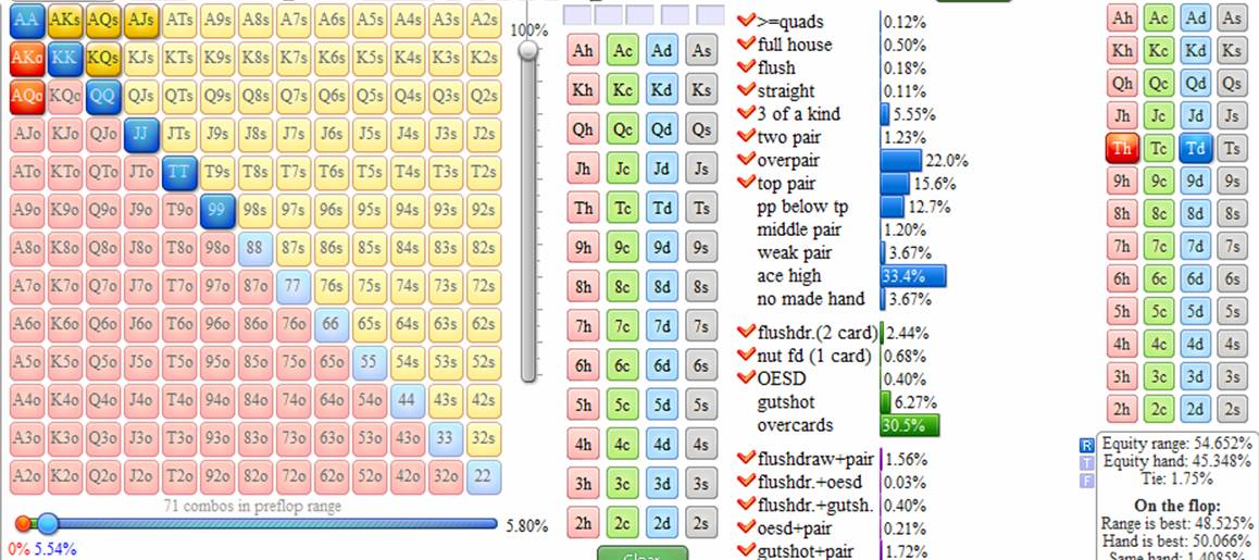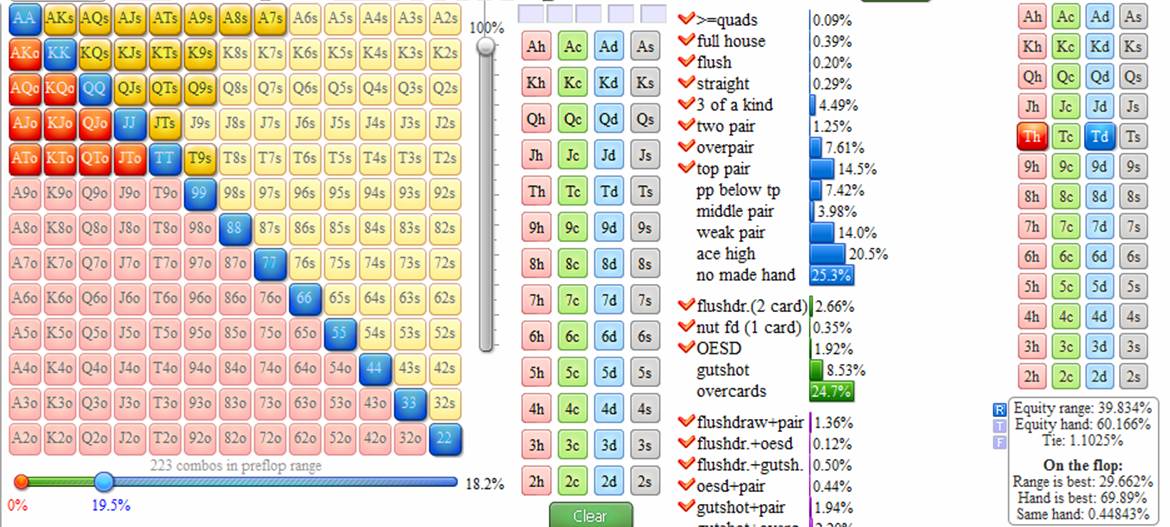 Là encore un peu de travail hors table se révèle utile: il nous faut 40% d’EV pour call, disons 45% pour compenser la variance et le rake.
