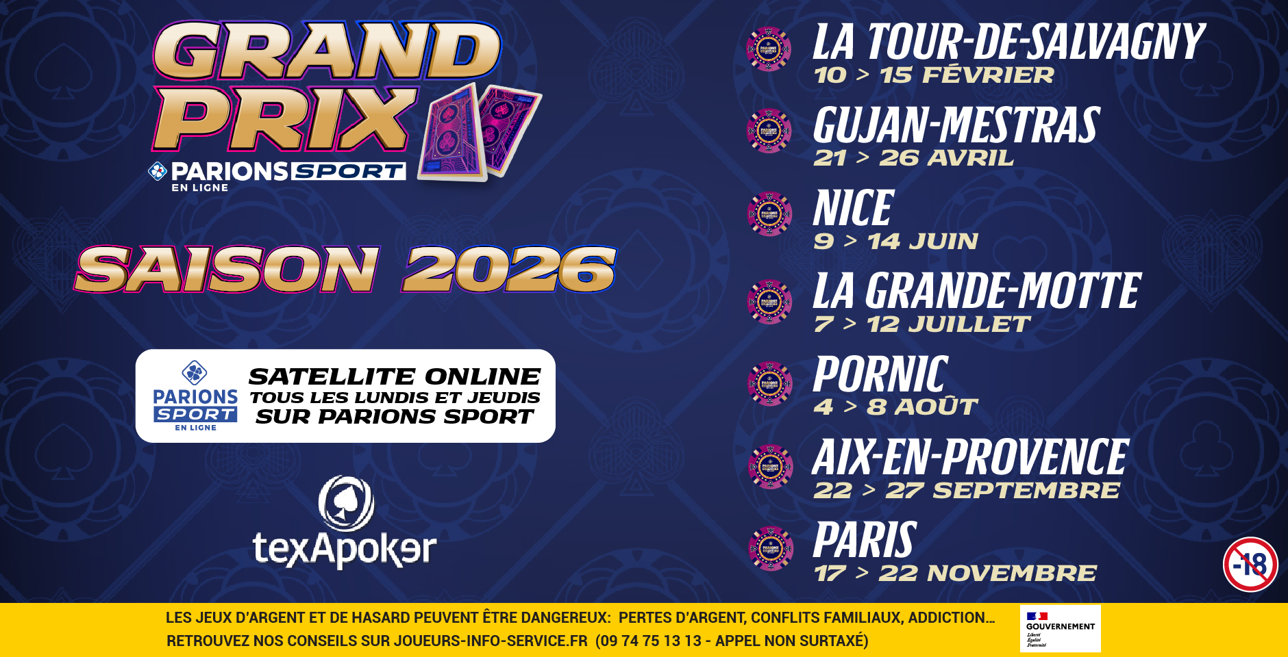 Le circuit Grand Prix by Parions Sport en Ligne, organisé en partenariat avec Texapoker, revient en 2026 pour une nouvelle saison riche en émotions !