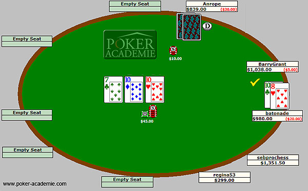 Anrope nous a attaqué au bouton. Nous avons simplement défendu avec T8o. Nous floppons brelan, il attaque après notre check.