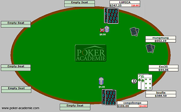 Nous avons attaqué au bouton avec AQs, les blinds ont payé. Le flop T83 rainbow, les 2 advesraires sont des regulars agressifs et nous sommes en train d'attendre le remplissage de la table.